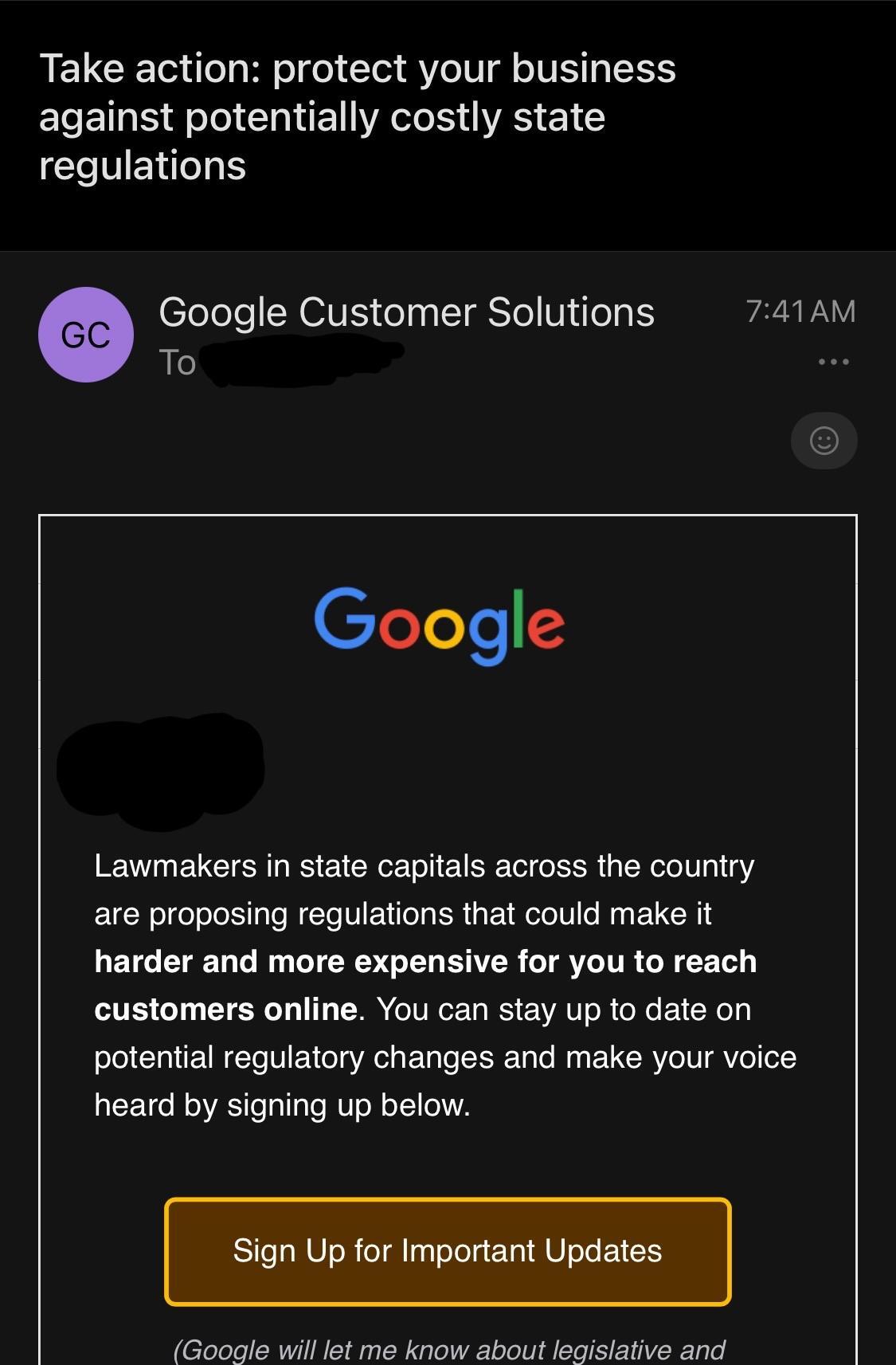 arrow-up1248arrow-down1imageGoogle encourages "protecting your business against costly state regulations"infosec.pubbuckbanzai@infosec.pub to Technology@lemmy.worldEnglish · 1 year agomessage-square24linkfedilinkfile-text