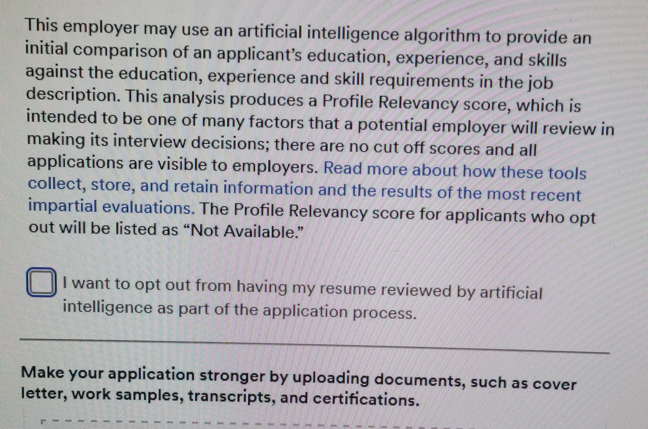 (Checkbox) I want to opt out from having my resume reviewed by artificial intelligence as part of the application process. ]