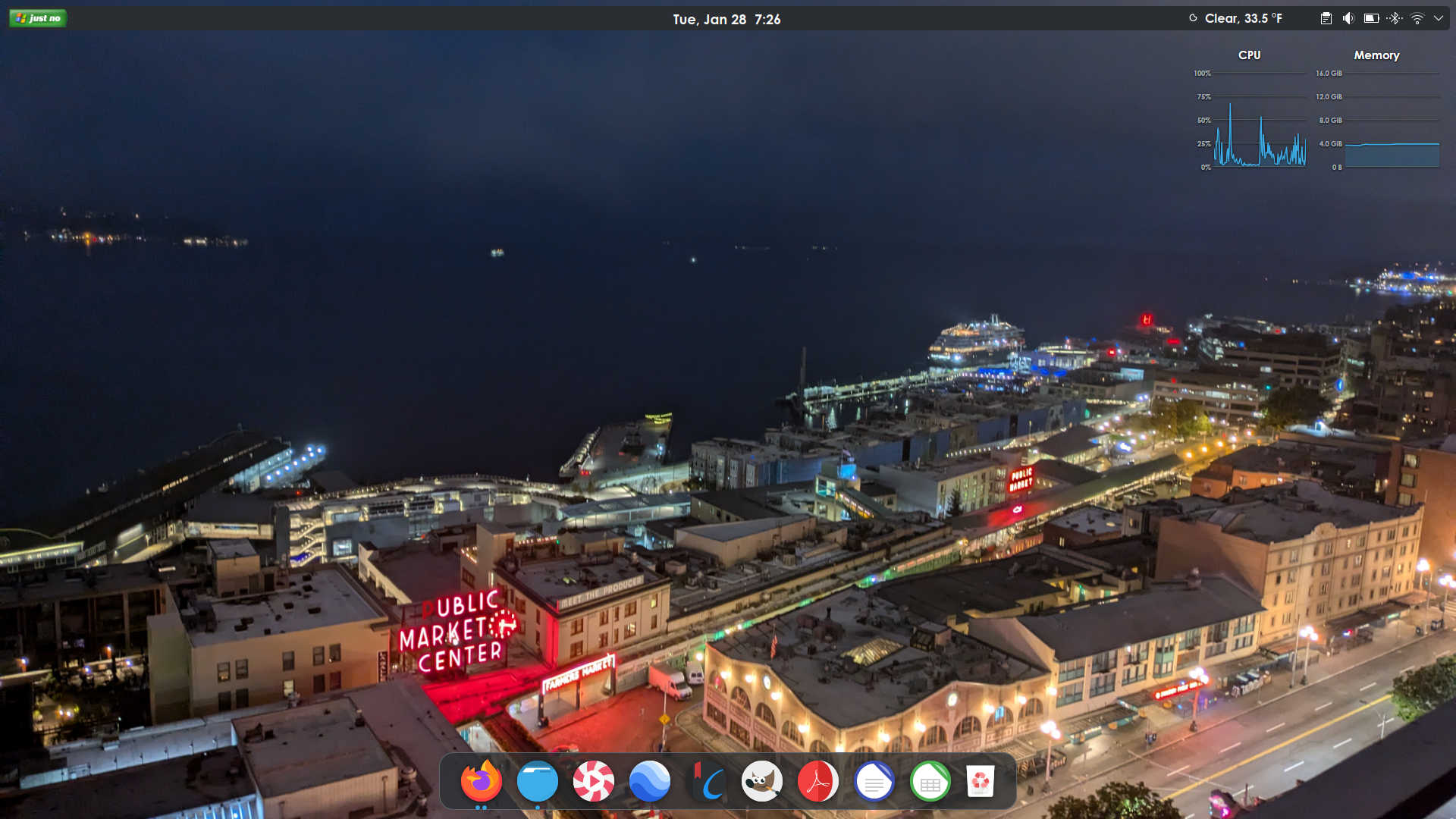 I still like the look and feel of GNOME a lot so I spent a little time putting it together that way. I want a simple desktop with small elements to maximize real estate for windows. I also use the small taskbar on my work computer for the same reason. But with my work computer, I do show window titles because I usually have at least 5 workbooks open at once so it’s nice to see which is which when I need to switch between them.
