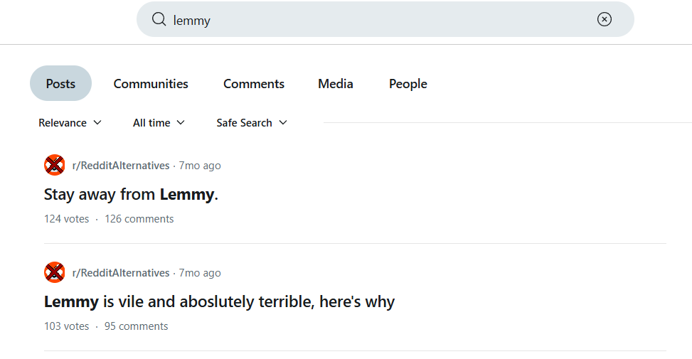 irelephant [he/him]🍭@lemm.ee to Reddit@lemmy.world · edit-26 个月前First two results when you search for lemmy on reddit.i.postimg.ccimagemessage-square427linkfedilinkarrow-up11Karrow-down116