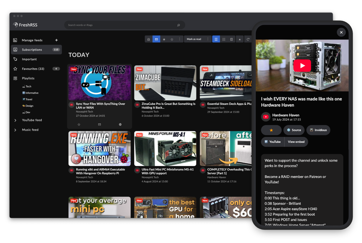 look so cool but i use freshrss for a lot of stuff in addition to youtube subscriptions, so i can’t convert my whole freshrss into this frontend. can’t imagine there’s anything in freshrss that would allow associating this with just one category. i could see myself running it as a seperate container, providing it my freshrss creds, and telling that new webserver container to associate it with a category. that’s basically a whole different project at that point though.