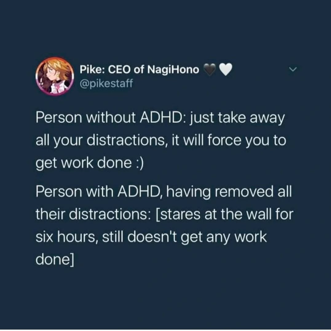 I get that the meme is being hyperbolic, but I find it kind of misleading. As someone who likely has ADHD or/and is on the spectrum, the idea of “sitting still and staring at a wall for 6 hours” doesn’t match how ADHD usually works. If I remove distractions, I don’t just freeze - I end up doing something else entirely, like watching YouTube or pacing around. The paralysis is real, but it’s more about being stuck in a loop of avoiding the right task while still seeking stimulation. So the meme’s wording just doesn’t land for me because it confuses task paralysis with total inactivity, which feels more like depression or burnout than ADHD. Maybe I’m just being too literal, but this is why it doesn’t click with me.