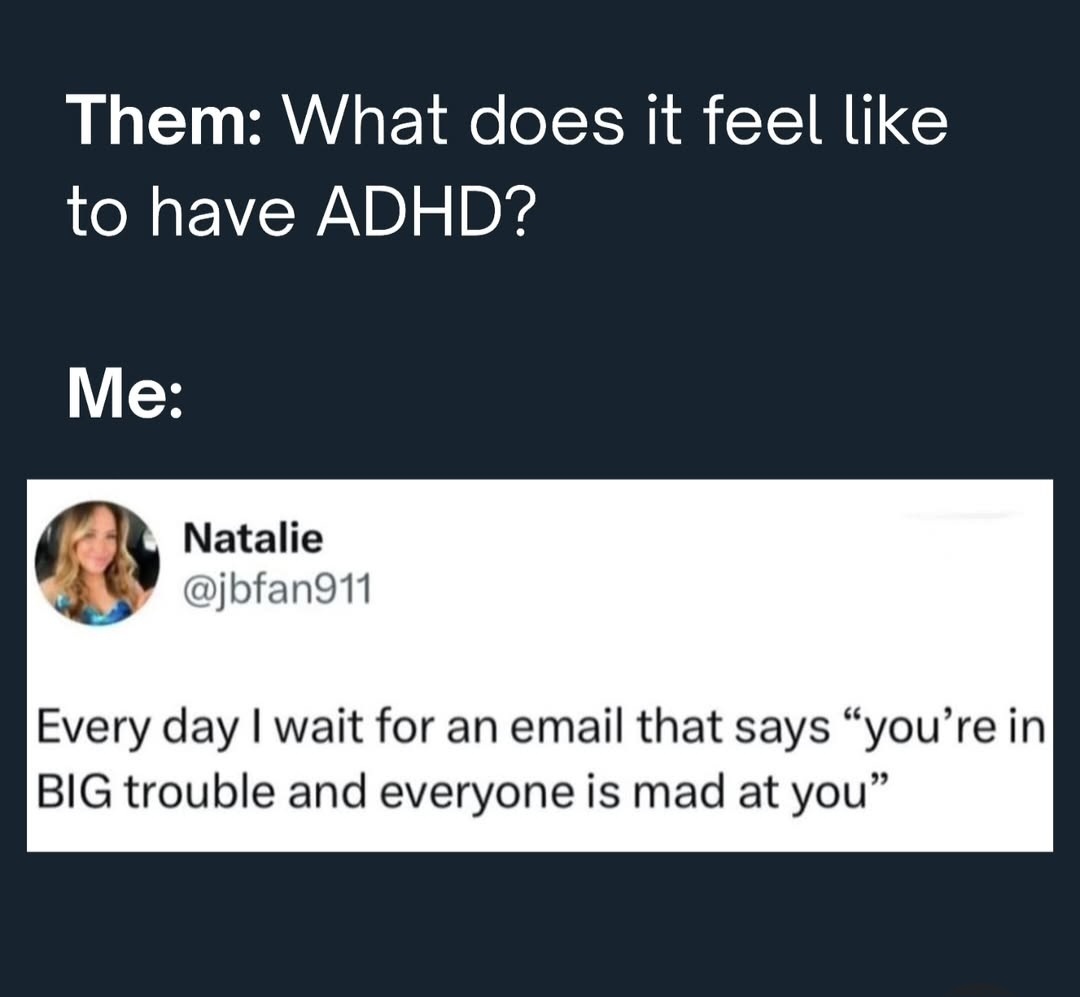 I’d agree, I live in the typical ADHD chaos but this meme doesn’t feel relatable to me. I guess I’m lucky? Anyway, I’d totally say this is about anxiety, not ADHD.