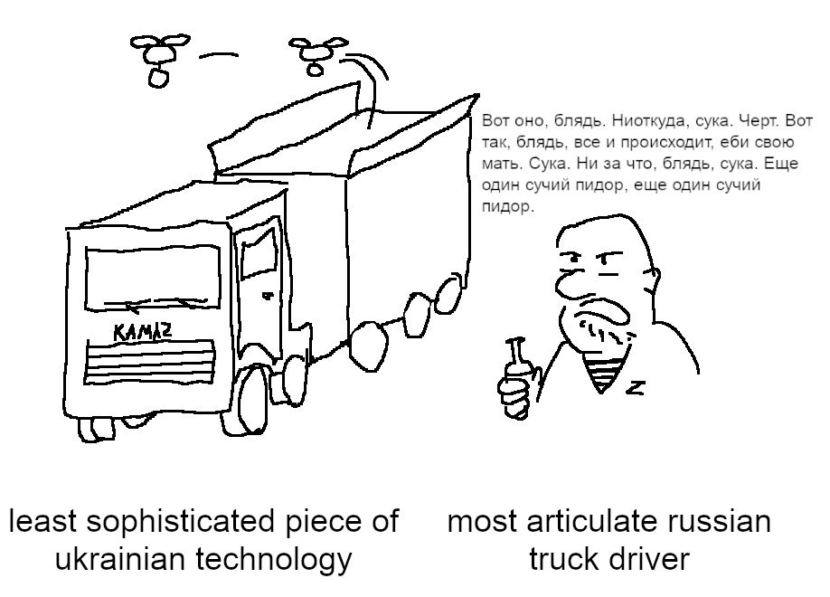 LOL, is he literally cursing at the drones happily coming out of a truck unimpeded and going on their merry way to the sound of explosions? Haha