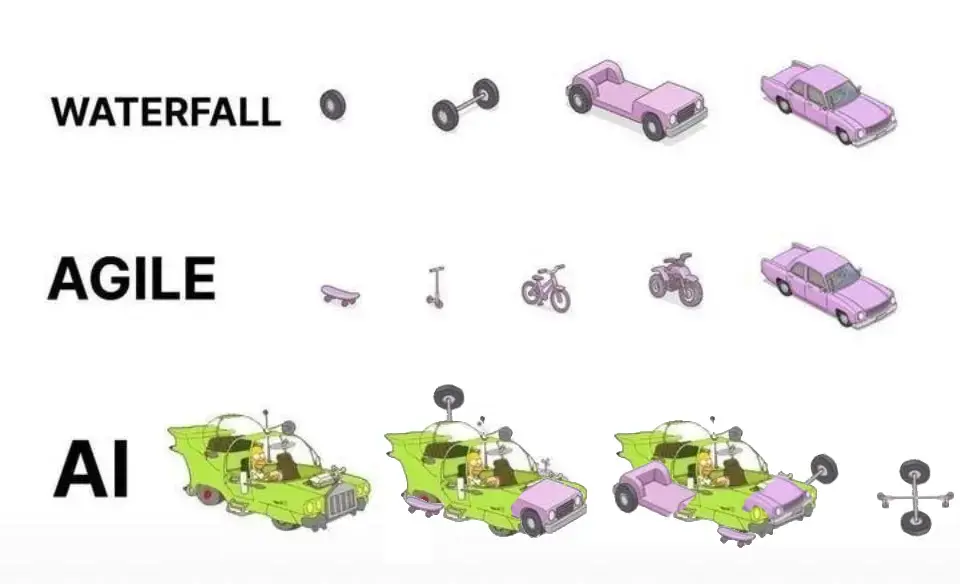 Waterfall: the car is “finished” at the end, but replace the engine with a huge roaring fire. The Dev team continues to put the engine fire out and build the engine for 3x the original project duration.