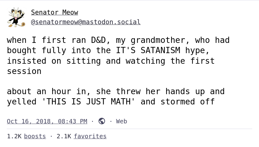 arrow-up11arrow-down1imageSatanic Mathplus-squarepawb.socialThefuzzyFurryComrade@pawb.social to RPGMemes @ttrpg.network · 9 months agomessage-square0linkfedilink